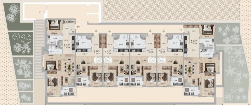 Zgrada ima šest spratova, u okviru kojih raspolaže sa dva poslovna prostora i 39 apartmana različite strukture: jednosobnih, dvosobnih i trosobnih. Svi stanovi u zgradi su južno orijentisani, a svaki stan, počev od prizemlja, ima direktan pogled na more. Udaljenost zgrade od plaže, marketa i restorana iznosi 200 m.